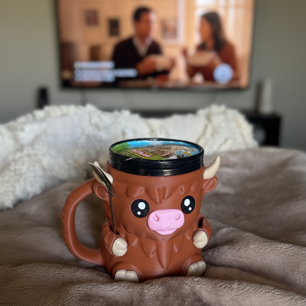 Der Muh Cup hält dein Lieblingseis ganz fest - ohne Kleckern, ohne Verrutschen. Seine stabiler 3D-Druck und das cute Design machen ihn zum praktischen Begleiter für Netflix-Abende allein oder zu zweit auf der Couch oder als Geschenk für echte Eisliebhaber.
